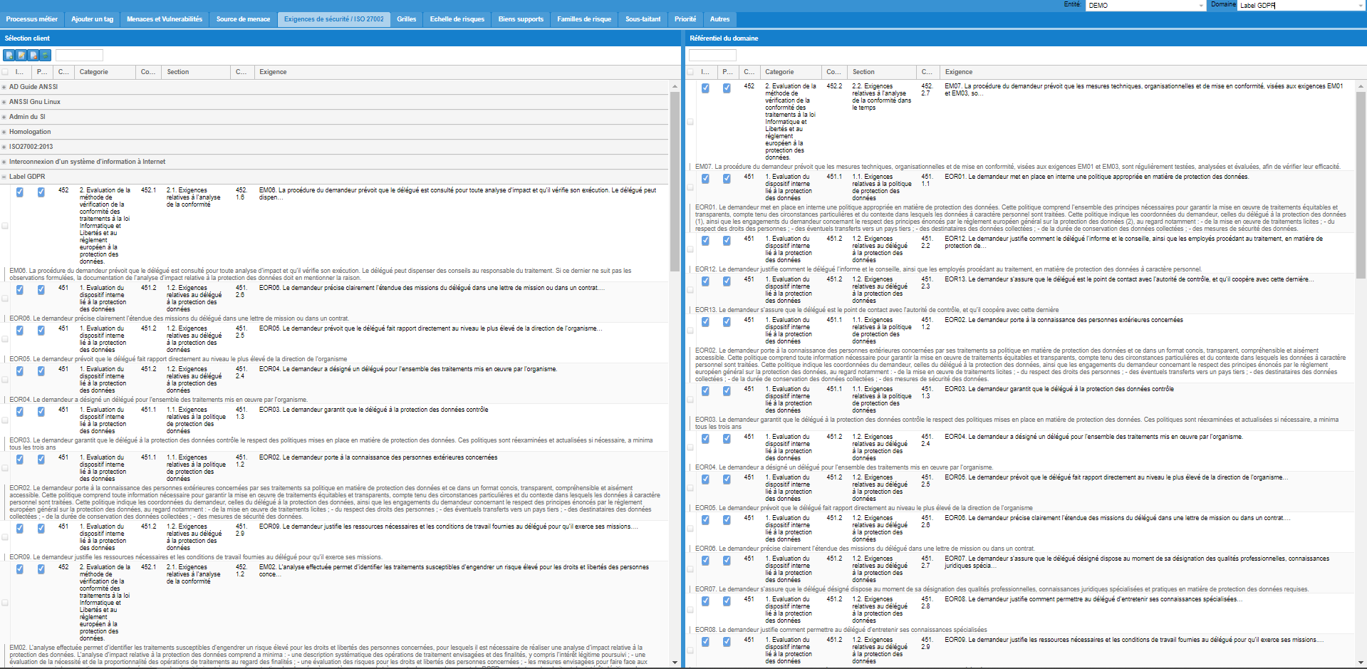 Une interface entièrement paramétrable proposant un éventail de référentiel ( ISO, SecNumCloud, Réf ANSSI, NIST, GDPR, Industrie… ) et la possibilité de les mixer d’un simple clic.